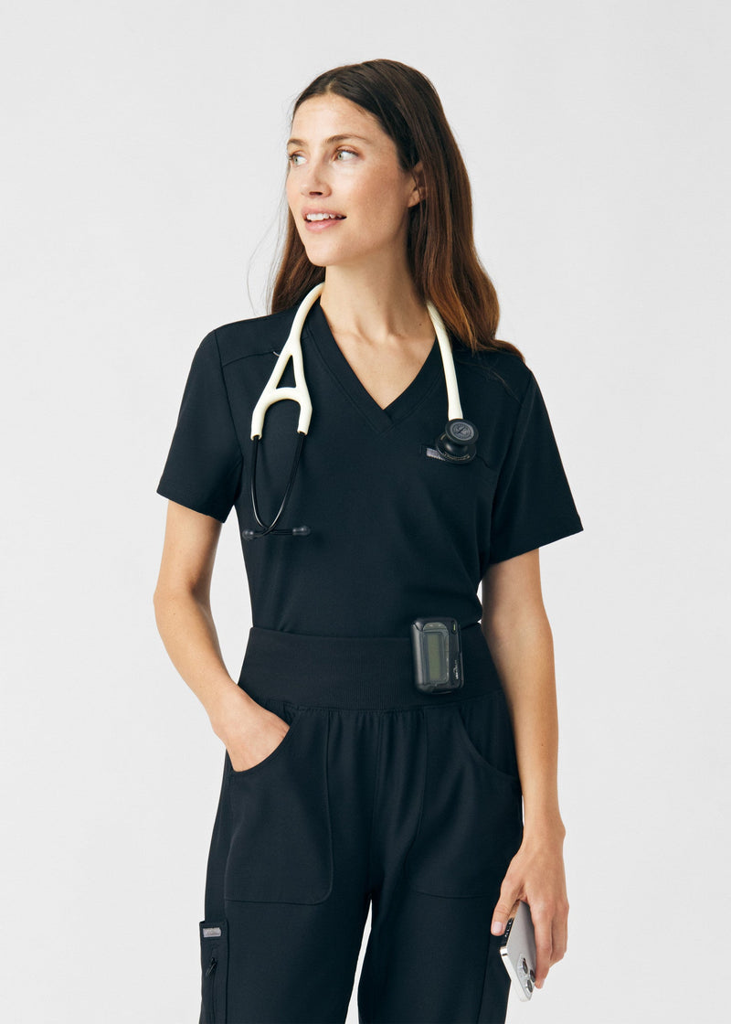 This modern fit scrub top features a soft rib-knit back neckband and rib-knit side panels for a comfortable and sleek fit. With a front welt chest pocket and right front zip security pocket, this top is the definition of a high-functioning style. Our modern tailored fit flatters your shape, while our moisture-wicking super stretch fabric provides the comfort and flexibility your work requires throughout the day.